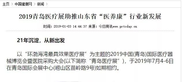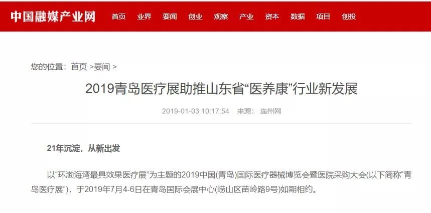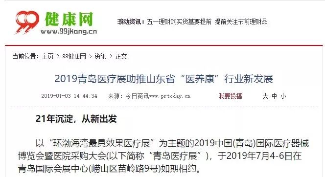 以“环渤海湾最具效果医疗展”为主题的2019中国(青岛)国际医疗器械博览会暨医院采购大会(以下简称“青岛医疗展”),于2019年7月4-6日在青岛国际会展中心(崂山区苗岭路9号)如期相约。